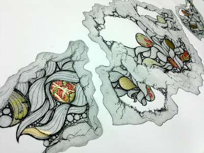 Growth and Process (Greens and Golds). When creating this print I experimented with using a touch of colour in the black ink just to lift it a little and give it a sense of life. A fellow student recommended this for me to try but I have never managed to get the ratio of the inks correct; I have always either put in too little colour, resulting in the colour being over powered by the black, or too much colour, resulting in... well, not the result I intended! Here are some photos of the inked up plates ready to be placed on the bed for the chine-colle pieces to be added.